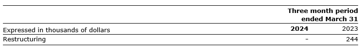 Administrative and general expenses as a percentage of revenues of 6.1 per cent for the first quarter of 2024 were lower on a nominal basis than the same period of 2023. Administrative and general expenses decreased $100,000 or 0.8 per cent to $14.2-million in the first quarter of 2024, compared with $14.3-million in the first quarter of 2023, mainly due to decreases in pension and professional services expenses, offset in part by increases in technology related expenses.