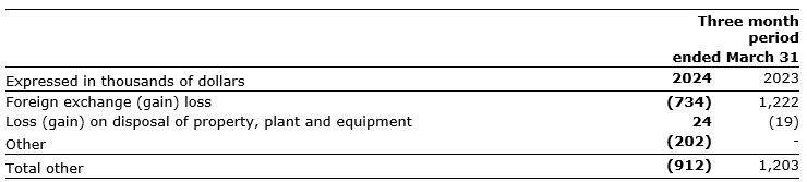 Other for the first quarter of 2024 included a $700,000 foreign exchange gain compared with a $1.2-million foreign exchange loss in the first quarter of the prior year. The movements in balances denominated in foreign currencies and the fluctuations of the foreign exchange rates impact the net foreign exchange gain or loss recorded in a quarter.