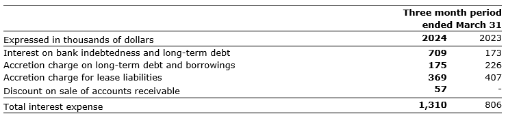 Total interest expense of $1.3-million in the first quarter of 2024 increased by $500,000 compared with the first quarter of 2023, mainly due to higher interest on bank indebtedness and long-term debt as a result of increased interest rates and higher principal amounts borrowed in the quarter as compared with the prior year.