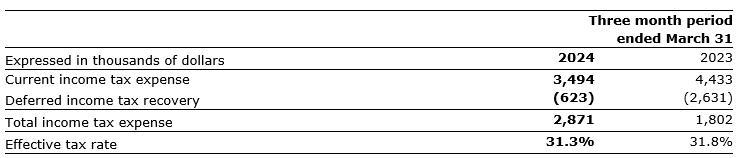 Income tax expense for the three months ended March 31, 2024, was $2.9-million, representing an effective income tax rate of 31.3 per cent, compared with 31.8 per cent for the same period of 2023. The change in effective tax rate and current and deferred income tax expenses year over year was primarily due to the change in mix of income and loss across the different jurisdictions in which the corporation operates and the reversal of temporary differences.