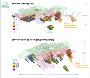 Results from MAD-22 and follow up sulphide exploration drilling continue to support the current interpretation of the mineralized system at the MOD. The large-scale nature of the supergene (oxide) mineralized body at the MOD, and the alteration assemblages and remnant primary sulphide-bearing structures encountered in MAD-22, 25, 26 and 27 continue to provide strong evidence for a sulphide-rich ‘feeder’ system which can be interpreted as the source for Marimaca’s oxide ore body. Chalcopyrite and pyrite-bearing mineralization encountered in drilling post-dates pervasive magnetite-actinolite alternation which is consistently found down-dip of the MOD and corresponds to the magnetic-highs identified in the high-resolution mag-drone surveys (see press release dated February 15, 2023).