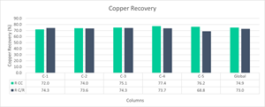 Table 4 and Figure 2 show the calculated head and head/ripio base copper recovery by columns. The average copper recovery of the 5 columns per head calculated was 74.9%, while the recovery per head/ripios was 73.0%. Results are in-line with expected results based on previous test-work and demonstrate that copper recovery can be maintained while optimizing the variables that reduce acid consumption and impurities generation.
