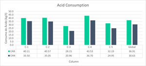 Results of the column test acid consumption is presented in Figure 1. Average CAB was 36.91kg/t while average CAN was 30.63kg/t.