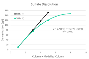 This concept is demonstrated in Figure 3. Whereby results from Geomet 6 show the experimental sulfate concentration in each cycle deviates and plateaus relative to the theoretical sulfate concentration with the correlation coefficient of the experimental results of 0.9992. When projecting the experimental curve 3 additional cycles, it can be observed that the sulfate saturation level is approximately 147 gpl.