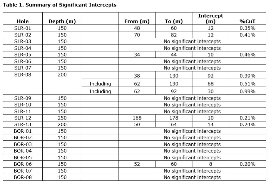 Drill hole, SLR-08, drilled south of the planned plant facilities in the San Lorenzo district, intersected 30m at 0.99% CuT from 62m within a broader zone of 68m at 0.51% CuT from 62m