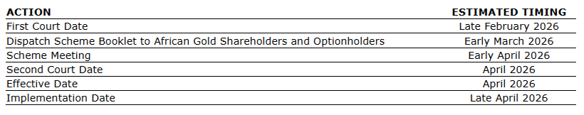 A scheme booklet setting out the key terms of the transaction, the independent expert report and the reasons for the recommendation of the independent African Gold directors will be sent to all African Gold shareholders and optionholders in due course. The scheme meetings to consider the transaction are expected to be held in early April, 2026, and the transaction is expected to be implemented before the end of April, 2026, subject to satisfaction of all conditions and receipt of all necessary approvals.