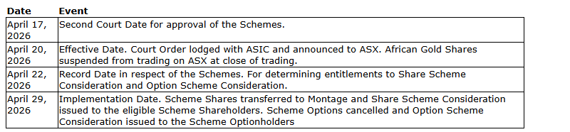 All dates are indicative only and are subject to, among other things, the satisfaction (or, where applicable, waiver) of the remaining conditions precedent under the scheme implementation deed entered into by Montage and African Gold on Nov. 28, 2025. For further details and for any changes to the above timetable, please refer to African Gold's communications.