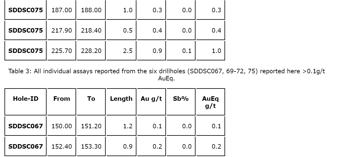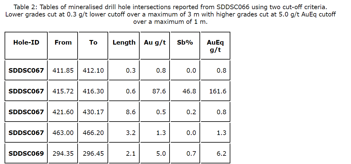 - 0.5 m at 159.3 g/t AuEq (74.0 g/t Au, 54.0 per cent Sb) from 415.8 m.