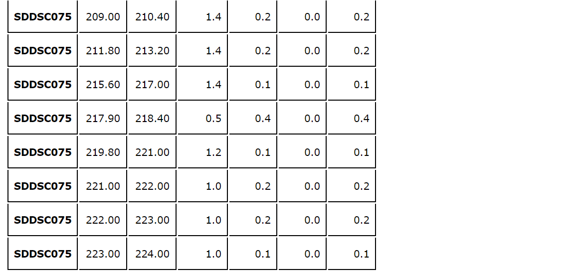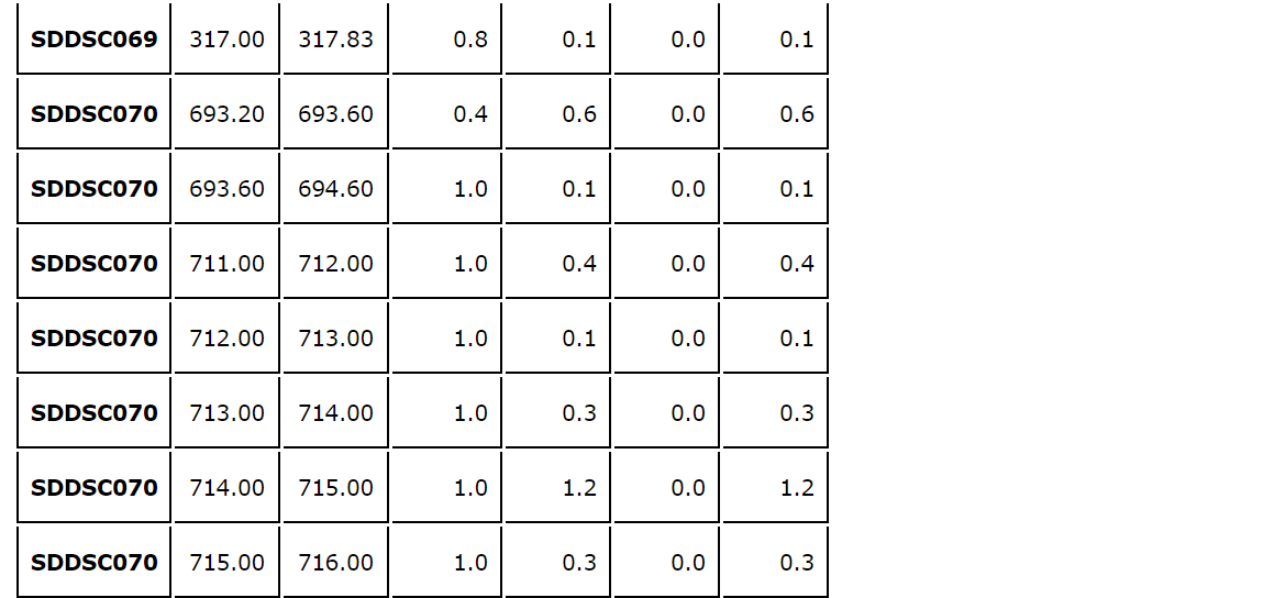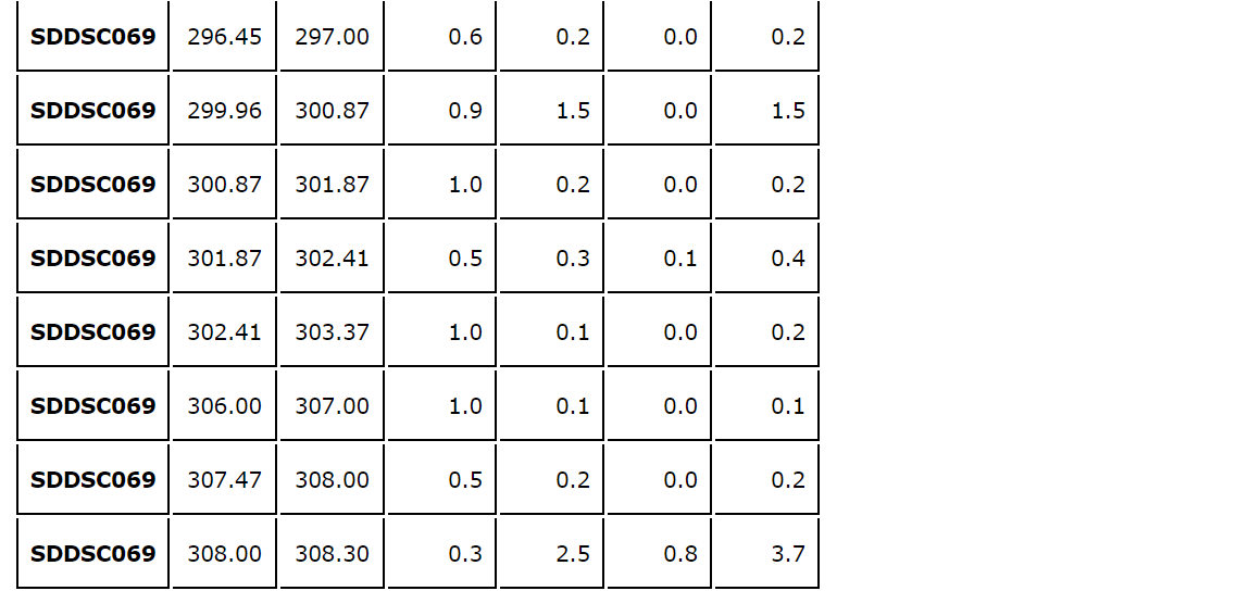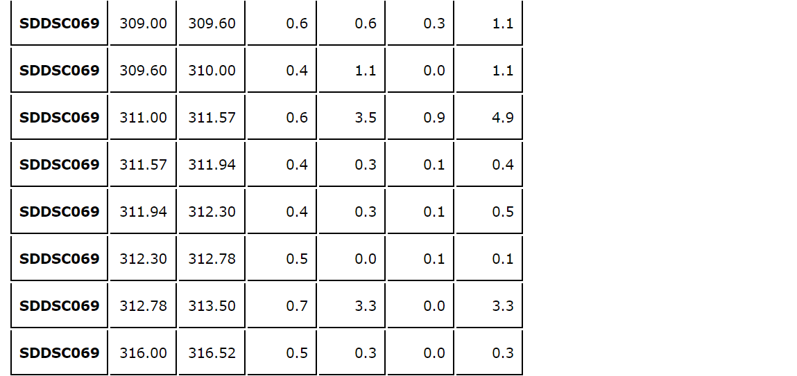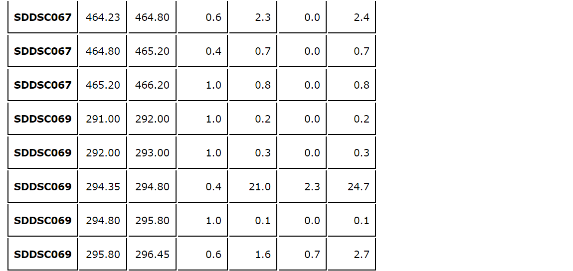 A sixth hole, SDDSC075, is the first hole to test the 200 m wide gap between Rising Sun and Gladys. The hole successfully proved the continuity of mineralization. Individual hole descriptions follow: