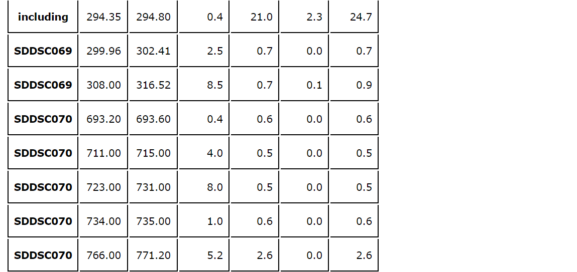 - SDDSC071 intersected the Rising Sun vein in a 90 m gap between MDDSC020 and MDDSC021, again demonstrating down-dip continuity over large distances. Highlights included: