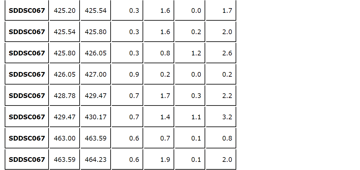 - SDDSC067 drilled a new vein to the west of the Rising Sun vein, previously only intersected by SDDSC050. SDDSC067 was drilled 115 m above SDDSC050 and highlights the continuity of mineralized structures at Sunday Creek. Highlights included: