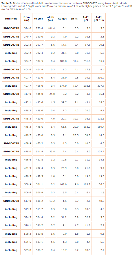 - Hole SDDSC077B intersected 404.4 m at 5.6 g/t AuEq (5.1 g/t Au, 0.3 per cent Sb) from 374 m (uncut). A selection of highlights include: