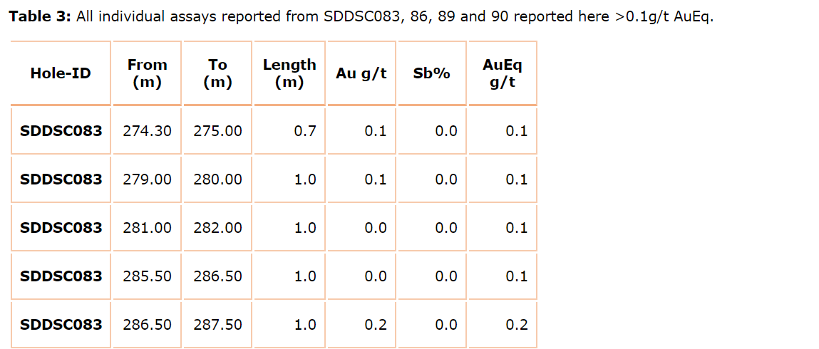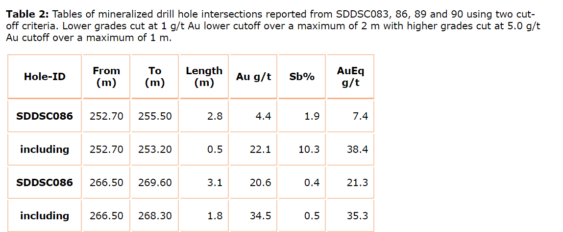 - 1.8 m at 35.3 g/t AuEq (34.5 g/t Au and 0.5 per cent Sb) from 266.5 m.