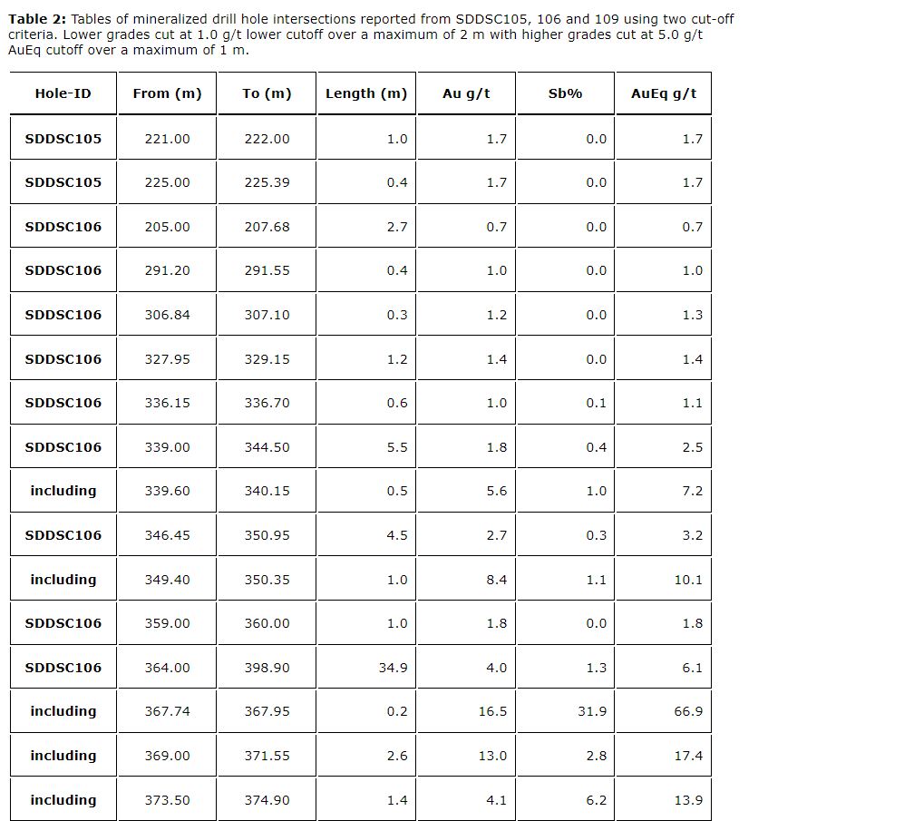 - SDDSC106, drilled east to west, successfully traversed six high-grade vein sets over a 200-metre interval. The hole contains eight intervals of greater than 15 grams per tonne gold (up to 59.9 g/t Au) and eight intervals of greater than 5 per cent antimony (up to 34.5 per cent Sb). Selected highlights include: