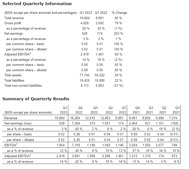 Net earnings for the three months ended March 31, 2023, were $500,000 or two cents per basic share, compared with net earnings of $200,000 or one cent per basic share in the first quarter of 2022. Adjusted EBITDA for the three months ended March 31, 2023, was $2.4-million compared with $1.5-million for the first quarter of 2022.