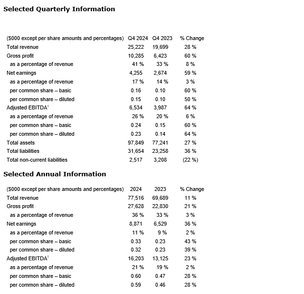 Adjusted EBITDA (earnings before interest, taxes, depreciation and amortization) increased to $6.5-million, or 26 per cent of revenue, compared with $4.0-million, or 20 per cent of revenue, in 2023;