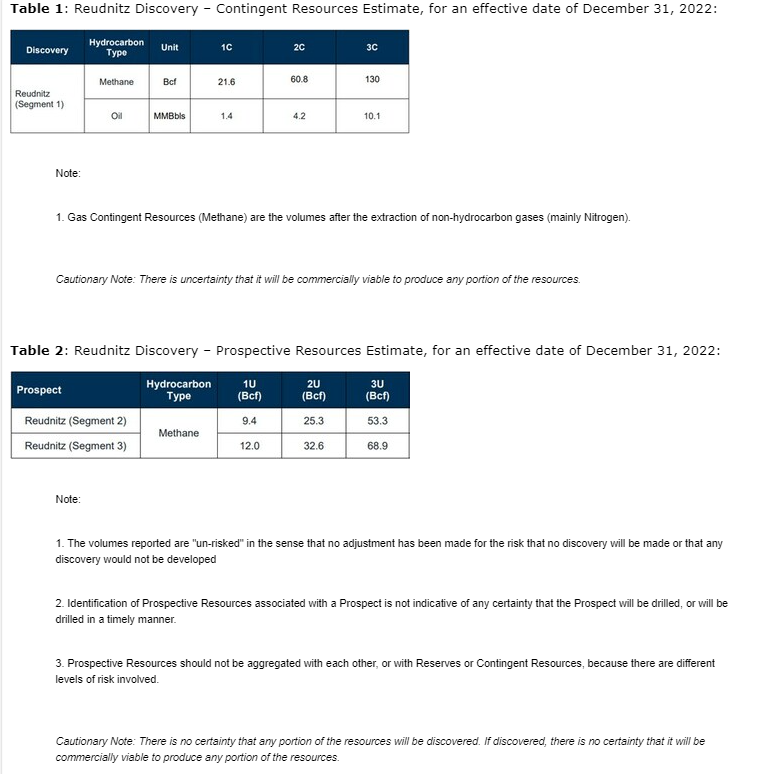 Based on its rigorous geological and geophysical assessments MCF Energy has confirmed the presence of significant quantities of petroleum and natural gas, indicating the potential for extensive petroleum and natural gas resources. The resources assigned are subject to significant risks. Gaffney Cline Associates Ltd. (GCA) prepared a resource audit report for the Reudnitz block, Germany, in February, 2023.