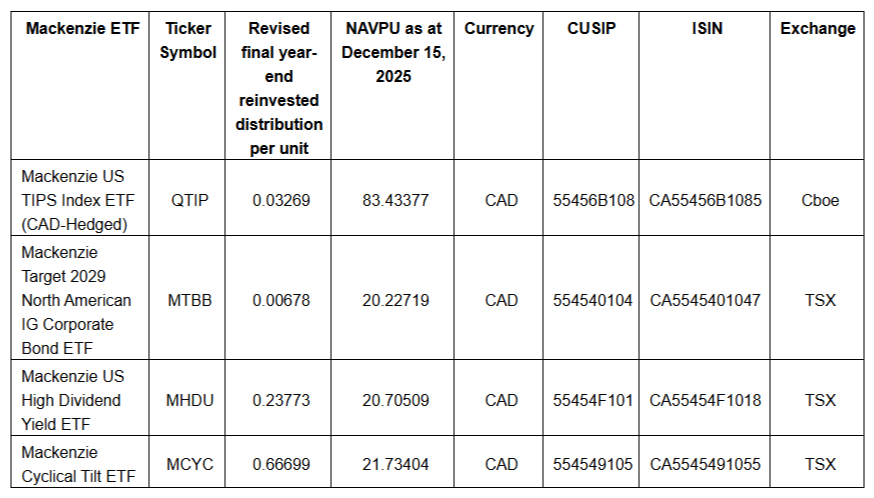 Mackenzie Investments has made revisions to the final year-end reinvested distributions of four Mackenzie exchange-traded-funds (ETFs) that trade on the Toronto Stock Exchange and Cboe Canada for the 2025 tax year. Please note that this is an update to the final year-end reinvested distribution previously announced on Dec. 23, 2025.
