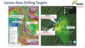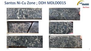 In July 2023, a shallow drill hole was completed on the Santos zone to investigate the thickness of the Ni-Cu zone discovered last April in drill hole MDLD0015 which had reported 0.45% Ni and 0.18% Cu over 10.37 metres (see press release by Midland dated April 27, 2023).