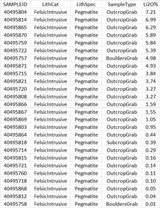 Samples were analyzed by ALS Geochemistry laboratories using a major element fusion, trace element fusion and ultratrace four acid digest method (ME-ICP06, ME-MS81 and ME-MS61L methods). Samples reporting >4500 ppm Li on the four acid digest method were reanalyzed by a sodium peroxide fusion method specific for hard rock lithium (Li-ICP82b).