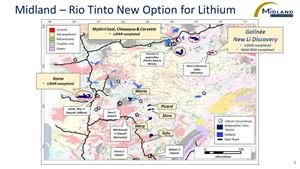 MONTREAL, Nov. 02, 2023 (GLOBE NEWSWIRE) -- Midland Exploration Inc. (“Midland”) (TSX-V: MD), in partnership with Rio Tinto Exploration Canada Inc. (“RTEC”), is pleased to provide new assay results and an update on completed and upcoming work following the identification of a series of spodumene-bearing pegmatite dykes on the Galinée project, approximately 8 kilometres east of the Adina lithium deposit held by Winsome Resources (“Winsome”) (see press release by Midland dated September 19, 2023). The Galinée project is currently wholly owned by Midland and is subject to an option agreement signed with RTEC in June 2023 (see press release by Midland dated June 14, 2023). Field crews began working on Galinée following the complete lift of access restrictions in the James Bay region as a result of forest fires in the summer of 2023. The field program, which began near the end of August and lasted until October 12th, also included work on other projects under the same option agreement such as Corvette, Chisaayuu and Mythril East.