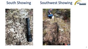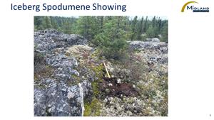 The Iceberg discovery was identified on several outcrops by field crews after a few days of prospecting. A combination of ultraviolet (UV) lamp and a LIBS (Laser-Induced Breakdown Spectroscopy) analyzer were used to confidently identify spodumene, including some crystals reaching up to 60 centimetres in length (see press release by Midland dated September 19, 2023). The Iceberg discovery consists of a series of spodumene exposures outcrop, now over a 600m east-west strike intermixed with amphibolite and granodiorite. Testing subtle local relief features in areas covered with vegetation and soil resulted in locating two new coarse spodumene-bearing pegmatite outcrops, located 500 and 900 metres south and southwest from the Iceberg showing. Assays are pending.