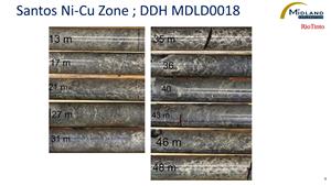 The Santos Ni-Cu zone was discovered in early 2023 following the drill testing of an electromagnetic VTEM anomaly. The discovery hole (MDLD0015) intersected, from 14 metres to 80 metres downhole depth, several layers with Ni-Cu mineralization within altered gabbro horizons. From 20.11 to 22.79 metres, the drill hole intersected 1.10% Ni and 0.71% Cu over 2.68 metres. Further down, from 33.02 to 43.39 metres, a mineralized interval graded 0.45% Ni and 0.18% Cu over 10.37 metres (see press release by Midland dated April 27, 2023).