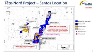 MONTREAL, Nov. 14, 2023 (GLOBE NEWSWIRE) -- Midland Exploration Inc. (“Midland”) (TSX-V: MD) is pleased to report that following the approval of permits, drilling has resumed along the extensions of the new Santos nickel-copper (“Ni-Cu”) discovery located on the Tête Nord property. This property is currently wholly owned by Midland but is subject to an option agreement with Rio Tinto Exploration Canada Inc. (“RTEC”) since December 2021 and is located near the town of La Tuque, Quebec (see press release by Midland dated December 2, 2021).