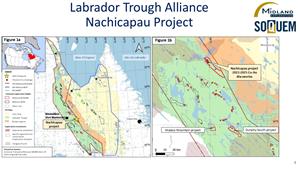 The Strategic Alliance enables Midland and SOQUEM to combine their efforts and expertise to jointly explore the excellent potential for gold and strategic minerals of the vast and underexplored Labrador Trough. The area of interest defined under the Alliance is located in Nunavik. Geologically, it covers the Labrador Trough, the Rachel-Laporte Zone and the Kuujjuaq Domain. The area of interest extends from Schefferville in the south up to approximately 100 km northwest of Kangirsuk. This agreement calls for investments in exploration reaching up to $5 million over a period of four (4) years, with a firm commitment of $2 million within the first two (2) years of the agreement. In March 2023, a joint venture agreement between Midland and SOQUEM was executed to define the terms governing exploration and development work on the mining claims forming the Nachicapau property. In 2025, the Alliance continued its exploration work in the Labrador Trough and on the Nachicapau project with a joint annual budget of $1 million (50% Midland and 50% SOQUEM).