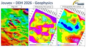 Exploration work resumed on the Jouvex property in 2024-2025 with the execution of two drone-supported magnetic surveys, followed by an induced polarization (IP) survey totalling 30 line kilometres in the fall of 2025. These surveys were conducted in the south part of the property, on a new target with gold potential. This target is located near a major structure that runs just north of the Douay gold deposit, where indicated and inferred resources are estimated at 3.038 million ounces of gold (2022 MRE, Maple Gold website). In January 2026, this area, which has been largely neglected in the past, will be tested by Midland by diamond drilling.