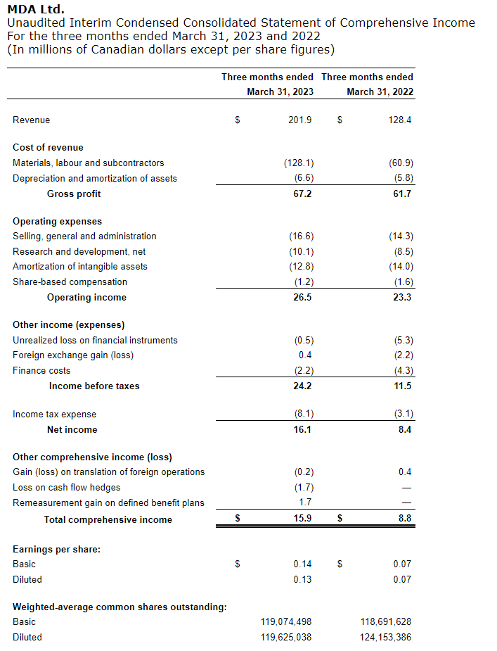 MDA Ltd. has released its financial results for the first quarter ended March 31, 2023.