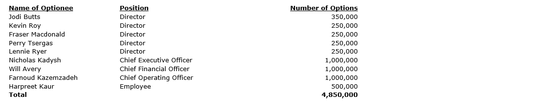 Pharmala has issued options to board members and officers, as detailed in the attached table. The options are issued subject to a vesting period, such that every three months 25 per cent of the allotment will be vested, such that the options shall be fully vested on the 12-month anniversary of the date of grant, which is April 20, 2026. The options have a fixed exercise price per share of 10 cents (subject to adjustment in accordance with the terms of the plan and/or stock option agreement). All vested but unexercised options shall expire and cease to be of effect on April 20, 2031.