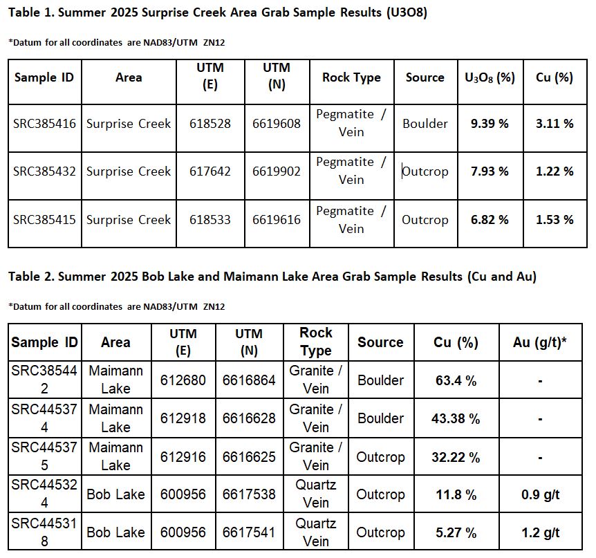 A strong uranium radiometric anomaly has been identified at the previously defined Surprise Creek Fault drill target, where historical drilling returned results of up to 2.1 metres of 4.37 per cent U3O8 (triuranium octoxide) from 57 metres. During the summer prospecting program, 37 grab samples were collected by Axiom in the Surprise Creek area, which hosts polymetallic-vein-type uranium-copper mineralization and returned encouraging assay results of up to 9.39 per cent and 7.93 per cent U3O8 with up to 3.11 per cent copper (Table 1). Uranium surface mineralization has been traced discontinuously over a strike length of approximately 500 metres, highlighting the potential scale of the system. In addition to uranium mineralization, the program confirmed the presence of several historic copper targets, significantly enhancing the project's multicommodity value proposition.