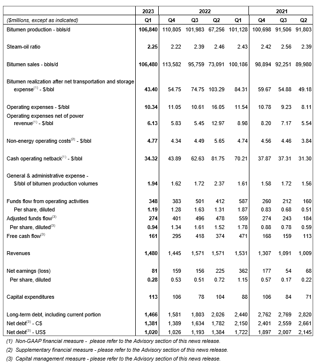 MEG ENERGY ANNOUNCES FIRST QUARTER 2023 FINANCIAL AND OPERATING RESULTS