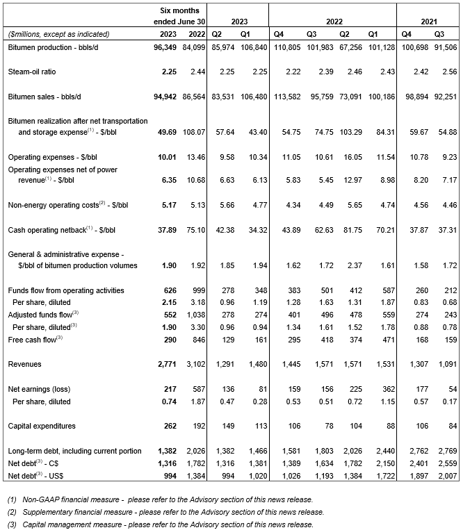MEG ENERGY ANNOUNCES SECOND QUARTER 2023 FINANCIAL AND OPERATING RESULTS