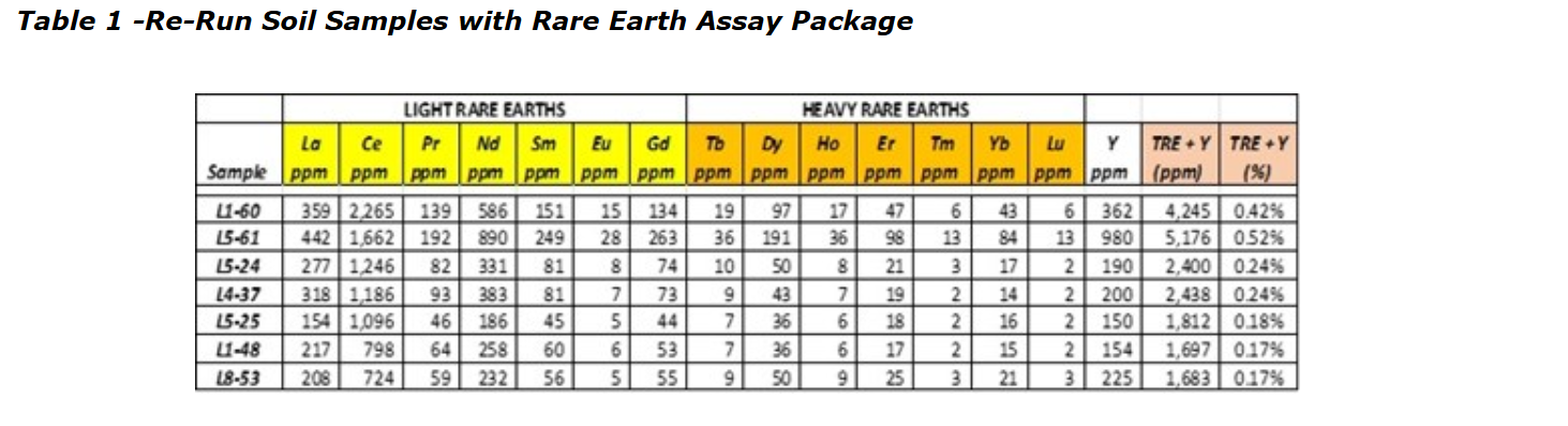 - Seven soil samples were rerun for the rare-earth elements (REE) specific test package for assays outlining the cerium anomaly and to check for other REE elements, including neodymium, praseodymium, gallium, et cetera.