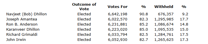 Navjeet (Bob) Dhillon, Joseph Amantea, Ron Anderson, Karanveer Dhillon, Richard Grimaldi and John Irwin were re-elected to the board of directors of the corporation for the coming year as follows.