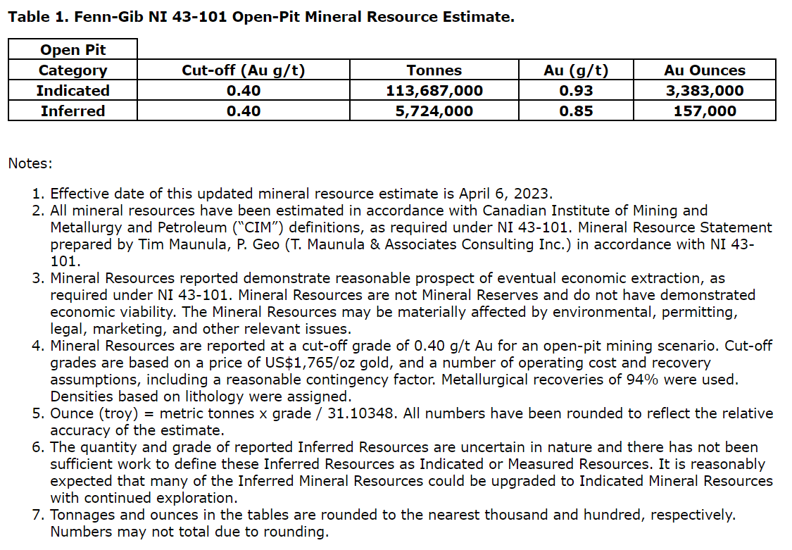 Fenn-Gib zone open-pit-constrained indicated resource of 3,382,788 ounces at 0.93 gram per tonne gold;