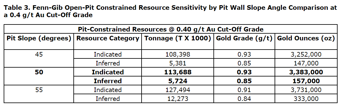 An attached table contains the updated interim Fenn-Gib zone open-pit-constrained mineral resource estimate; another table details the Fenn-Gib zone open-pit-constrained resource sensitivity by gold cut-off grades; and another table demonstrates the Fenn-Gib zone open-pit-constrained resource sensitivity comparison by open-pit wall slope angle.