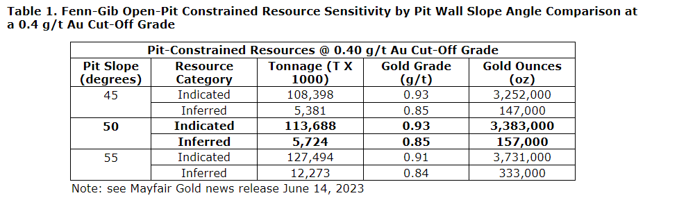Mayfair Gold President and CEO Patrick Evans commented: "Mayfair's recently reported pit-constrained resource update assumed a 50-degree pit slope angle. The potential exists to significantly increase the Fenn-Gib resource ounces by increasing the open-pit wall slope angle above 50 degrees. Analysis of the data from the field program is now underway, and the results are expected during the current quarter."