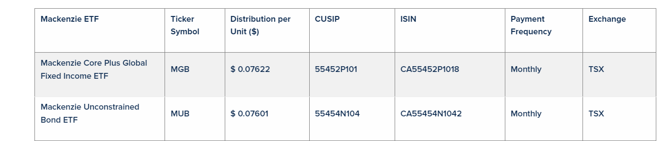 Mackenzie Investments has declared the April, 2024, monthly cash distributions for its exchange-traded funds listed in an attached table that trade on the Toronto Stock Exchange and Cboe Canada. Unitholders of record on May 2, 2024, will receive cash distributions on May 9, 2024.