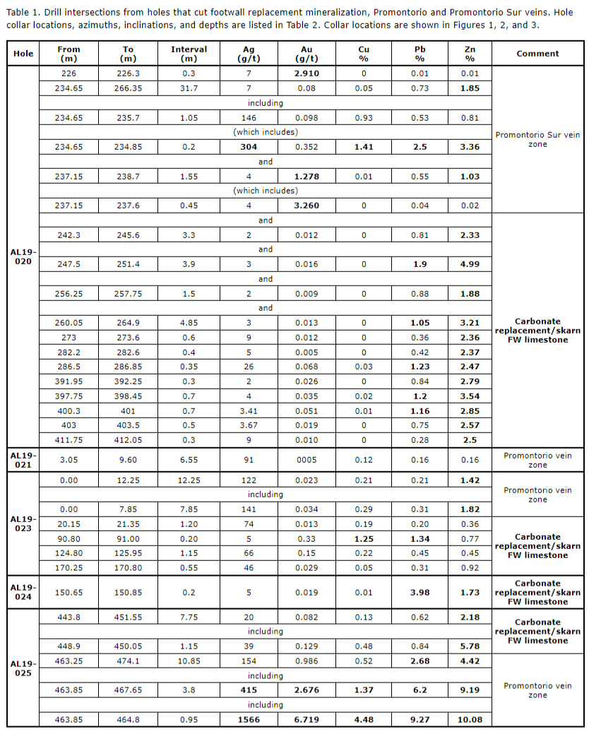 CRD mineralization cut so far at Alamos is characterized by zinc and lead sulphides that replace recrystalized limestone in the footwall of the Promontorio and Promontorio Sur vein zones. These veins are emplaced along and parallel to north-northeast faults that juxtapose andesitic agglomerate, recrystallized limestone and granodiorite. Intersections of this footwall carbonate-replacement mineralization were reported along with vein mineralization in Minaurum Gold's news release dated Aug. 22, 2019 (see the table entitled "Drill intersections from holes that cut footwall replacement mineralziation, Promontorio and Promontorio Sur veins"), but not pursued due to the company's focus on silver and gold.