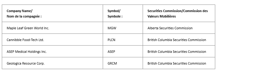 Effective immediately, the companies named in the attached table have been suspended pursuant to Canadian Securities Exchange Policy 3. The suspensions are considered regulatory halts as defined in National Instrument 23-101, Trading Rules. Cease trade orders have been issued by one or more securities commissions.