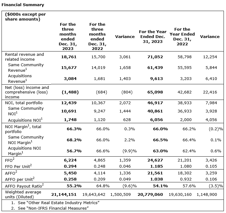 - Same-community revenue (1) for the three months ended Dec. 31, 2023, was $15.7-million, up 11.8 per cent compared with $14.0-million for the three months ended Dec. 31, 2022.