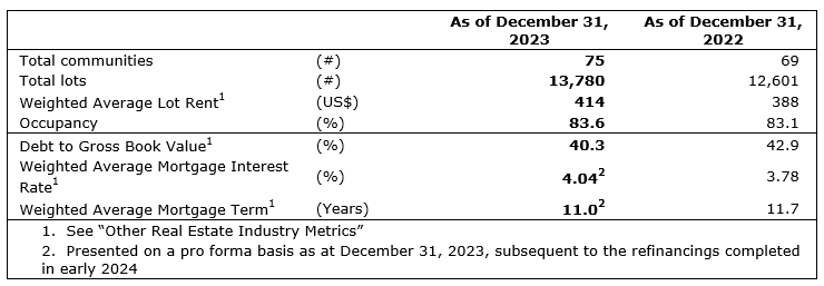 As at Dec. 31, 2023, the REIT owned a 100-per-cent interest in a portfolio of 73 MHCs with 13,310 lots, as well as two recreational vehicle (RV) resort communities with 470 sites, An attached table provides a summary of the REIT's portfolio as of Dec. 31, 2023, compared with Dec. 31, 2022.