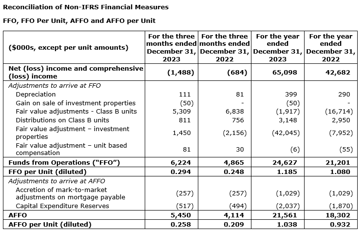 - AFFO per unit (diluted) (2) for the year ended Dec. 31, 2023, was $1.038, which was an increase of 10.6 cents per unit or 11.4 per cent compared with 93.2 cents for the year ended Dec. 31, 2022.