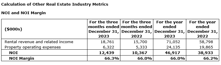 NOI and NOI margin for the fourth quarter of 2023 were $12.4-million and 66.3 per cent, respectively, compared with $10.4-million and 66.0 per cent during the fourth quarter of 2022. NOI and NOI margin for the year ended Dec. 31, 2023, were $46.9-million and 66.0 per cent, respectively, compared with $38.9-million and 66.2 per cent for the year ended Dec. 31, 2022.