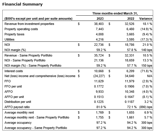 FFO in Q1 2023 was $11.6-million or 17.72 cents per unit, compared with $12.0-million or 19.06 cents per unit in Q1 2022. AFFO in Q1 2023 was $9.9-million or 15.13 cents per unit compared with $10.3-million or 16.47 cents per unit in Q1 2022. The declines in Q1 2023 were primarily attributable to the increase in finance costs due to high interest rates on variable rate mortgages and the REIT's credit facility, as well as increased draws on the credit facility, partially offset by higher NOI. AFFO and AFFO per unit were also impacted by an increase in the maintenance capital expenditure reserve from the addition of the properties acquired subsequent to Q1 2022.