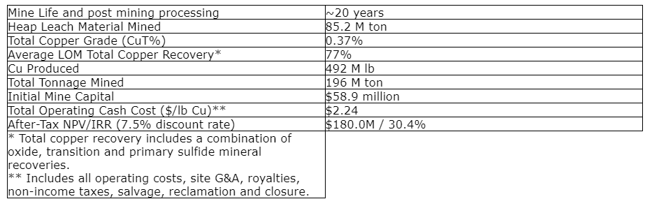 An updated preliminary economic assessment (PEA) incorporating sulphide leaching technology was announced Feb. 22, 2023. Mining of JCM would be by traditional open pit. The highlights of the PEA financial model, using a copper price of $3.75/pound, show an after-tax net present value of $180-million (U.S.) (7.5-per-cent discount rate), and an after-tax internal rate of return of 30.4 per cent. The results are tabulated herein.
