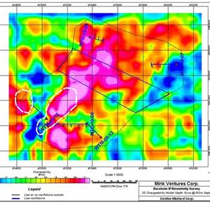 Montcalm - 3D Borehole IP Resistivity Plan 500 Meter Level (Target Area - White Dashed Line)